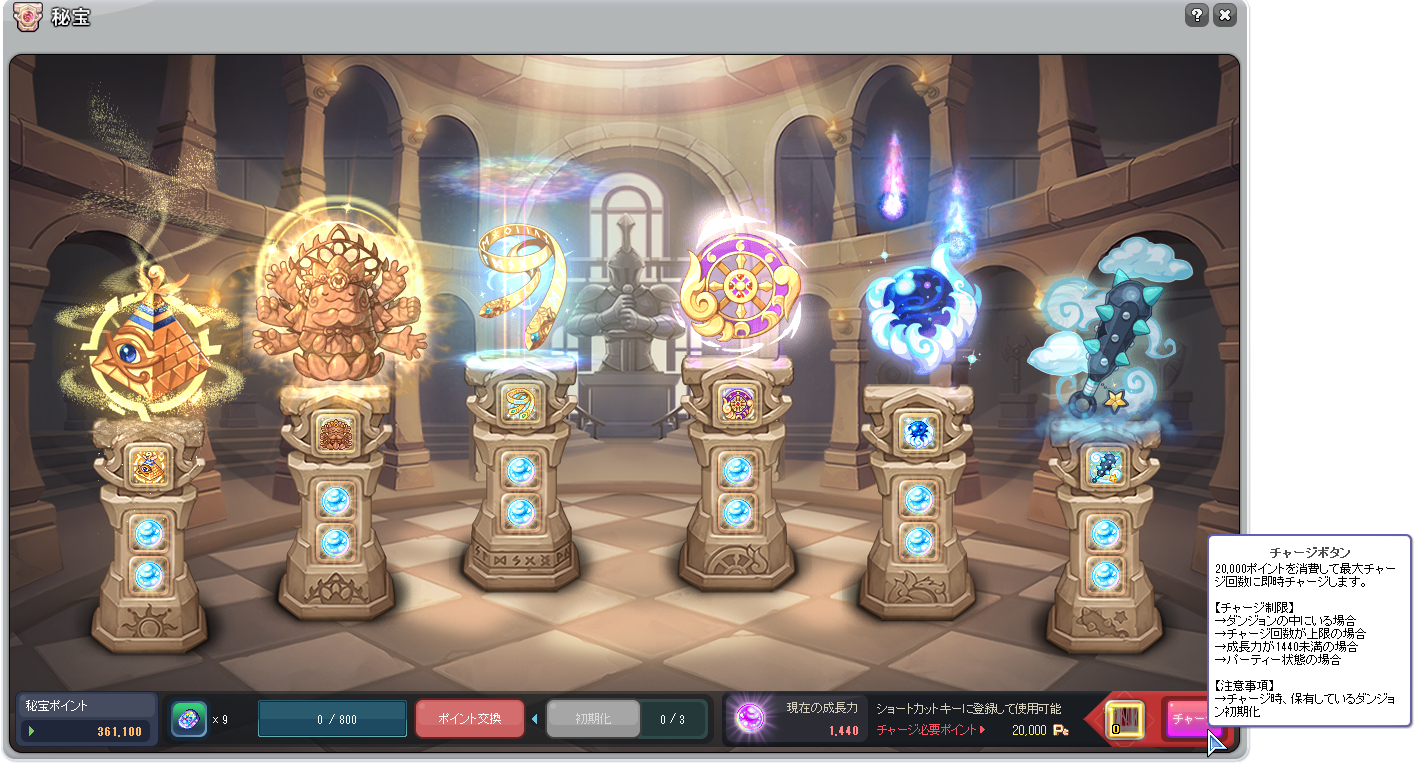 今まで再チャージに時間がかかっていた秘宝スキルが、「秘宝ポイント」を使用することで即時チャージ可能に!